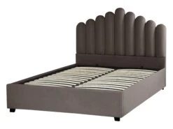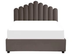 Voeg luxe toe aan je slaapkamer met dit prachtige bed. Het houten frame is volledig bekleed met zijdezachte bekleding van polyester fluweel in een warme taupe tint. Het bed heeft een prachtig hoofdeinde dat als een zeeschelp vormgegeven is voor een glamoureus tintje. Het frame biedt een ruime, ottoman opbergruimte verborgen onder een robuuste lattenbodem, die een perfecte ondersteuning vormt voor elke matras. Chique en stijlvol, perfect voor in een modern interieur.