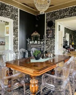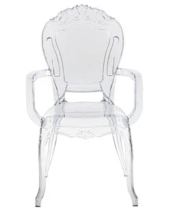 Klassiek ontwerp en fijn materiaal. De gebogen vorm van de stoelen, de slanke poten en de karakteristieke versieringen op de rugleuningen en onder de stoelen doen denken aan klassieke stoelen van vroeger. Maar in plaats van hout dat is bekleed met zwaar fluweel of brokaat, zijn deze stoelen gemaakt van hoogwaardig polycarbonaat. Het materiaal is UV-bestendig, robuust en gemakkelijk te reinigen. De transparantie onderstreept de moderne touch en geeft lichtheid aan de stapelbare stoelen.