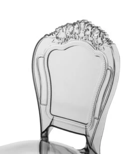 Klassiek ontwerp en fijn materiaal. De gebogen vorm van de stoelen, de slanke poten en de karakteristieke versieringen op de rugleuningen en onder de stoelen doen denken aan klassieke stoelen van vroeger. Maar in plaats van hout dat is bekleed met zwaar fluweel of brokaat, zijn deze stoelen gemaakt van hoogwaardig polycarbonaat. Het materiaal is UV-bestendig, robuust en gemakkelijk te reinigen. De transparant zwarte kleurtoon onderstreept de moderne touch en geeft lichtheid aan de stapelbare stoelen. Met hun ongebruikelijke ontwerp onderstrepen zij zowel moderne als klassieke interieurstijlen.