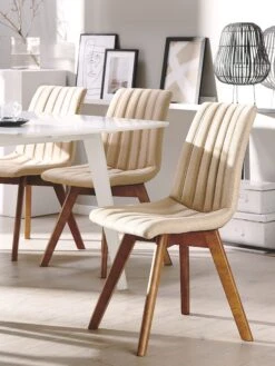 Geef jouw eetkamer een vleugje retro charme met deze set eetkamerstoelen. De zitting is voorzien van een metalen constructie voor een optimale levensduur, terwijl de zachte vulling een hoog comfort garandeert. De duurzame polyester bekleding is buitengewoon onderhoudsvriendelijk en past perfect bij de donkere toon van de massief beukenhouten poten. Het ontwerp van de eetkamerstoelen wordt benadrukt door de klassieke verticale stiksels op de rugleuning en zitting. Combineer ze met een tafel met een vergelijkbaar ontwerp en creëer de perfecte plek voor het houden van familiediners.
