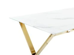 Verhoog de stijl van je eetkamer met deze stijlvolle glamour tafel. De tafel heeft een glanzende afwerking met stabiele gouden poten en een glazen tafelblad waardoor hij zeker zal opvallen. Dankzij de gebruikte materialen heeft de tafel geen dagelijks onderhoud nodig om jaren lang mee te aan en kan het makkelijk worden schoongemaakt. Door zijn formaat kunnen er makkelijk 4 personen aan zitten die voldoende ruimte hebben om te eten en drinken.