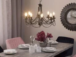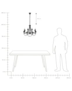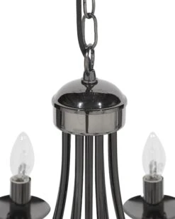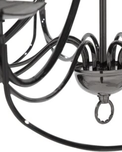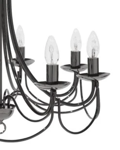 Een klassieke kroonluchter in een moderne vorm. Prachtig gebogen lichte armen en kaarsvormige bollen zorgen voor een romantische sfeer. Het zwarte metaal en de robuuste ketting geven een stoere touch.