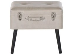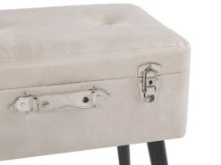 Deze vintage geïnspireerde hocker is bekleed met beige kunstleer en heeft decoratieve knopen, glanzende zilveren scharnierende gespen en een stijlvolle handgreep. De hocker kan worden geopend als een echte koffer en biedt veel opbergruimte voor kleine dingen. De slanke, elegante poten geven de hocker een minimalistische touch.