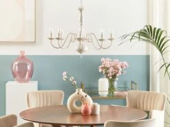 De stijlvolle, eenvoudige vormen en traditionele materialen van de lamp zorgen voor een moderne uitstraling. In grote kamers met hoge plafonds kun je de kroonluchter gebruiken om een comfortabel interieur te creëren waarin je op elk gewenst moment kunt ontspannen.