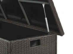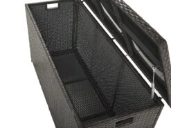 Deze kussenbox biedt veel opbergruimte en beschermt jouw kussens en dekens tegen water en zon. Dankzij de twee praktische handgrepen aan de zijkanten is de tuinkist gemakkelijk te vervoeren. Het rotandeksel kan gemakkelijk worden geopend en gesloten met twee gasveren. Een zwarte binnenschaal voorkomt het binnendringen van vuil en insecten. Het binnenste omhulsel uit één stuk is bevestigd met een sterke klittenbandsluiting en heeft dus optimale grip en kan indien nodig worden vervangen of gewassen. Houd er rekening mee dat bij zware en langdurige regenval de doos moet worden afgedekt.