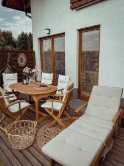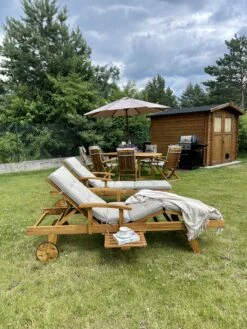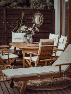 Een elegante ligstoel op wieltjes, met een ergonomisch ontwerp om in absoluut welzijn te loungen. Verstelbare rugleuning en voetensteun, evenals ingebouwde armleuningen, zorgen voor totaal comfort. Acaciahout is zeer duurzaam. Wanneer acaciahouten meubelen onbehandeld aan de elementen worden blootgesteld, krijgen ze na verloop van tijd een zilverachtige patina, iets waar veel kenners zo dol op zijn. Elk massief stuk hout kan iets verschillen in structuur en kleur.