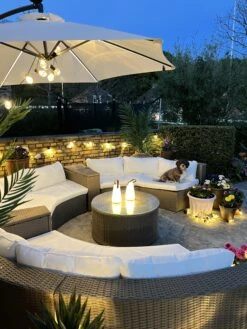 Licht waterafstotend waardoor je ze gemakkelijk buiten kan gebruiken, en buiten kan houden ondanks regen en vochtigheid. Wanneer het niet mogelijk is om binnen te zetten wanneer deze niet wordt gebruikt, raden we aan om een hoes te gebruiken. Het langdurig blootstellen van meubels en accessoires aan vocht kan schade veroorzaken.