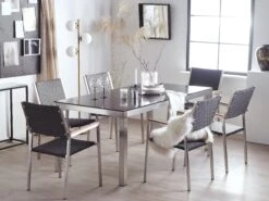 Een exclusieve tuinset die een stijlvolle touch geeft aan je tuin of terras. Met een mooie combinatie van roestvrij staal en glas voor een moderne uitstraling. Het tafelblad is weerbestendig en de lichte kleur past perfect bij de zilveren contouren. Het stalen frame is duurzaam, waardoor de meubelen ook na verloop van tijd mooi blijven. Stapelstoelen van stevig frame en UV-bestendig wit materiaal zijn een perfecte aanvulling op de tafel.