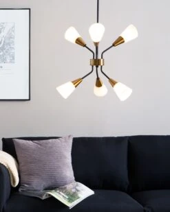 Deze wandlamp heeft alles wat een klassieker nodig heeft: elegante kleuren, een stijlvolle vorm en veel lichtbronnen. De structuur is gemaakt van metaal in diepzwart, terwijl de conische lampenkappen zijn gemaakt van wit glas, dat een aangenaam, fel licht uitstraalt. Dankzij de gouden decoratieve elementen heeft de lamp een bijzondere uitstraling.